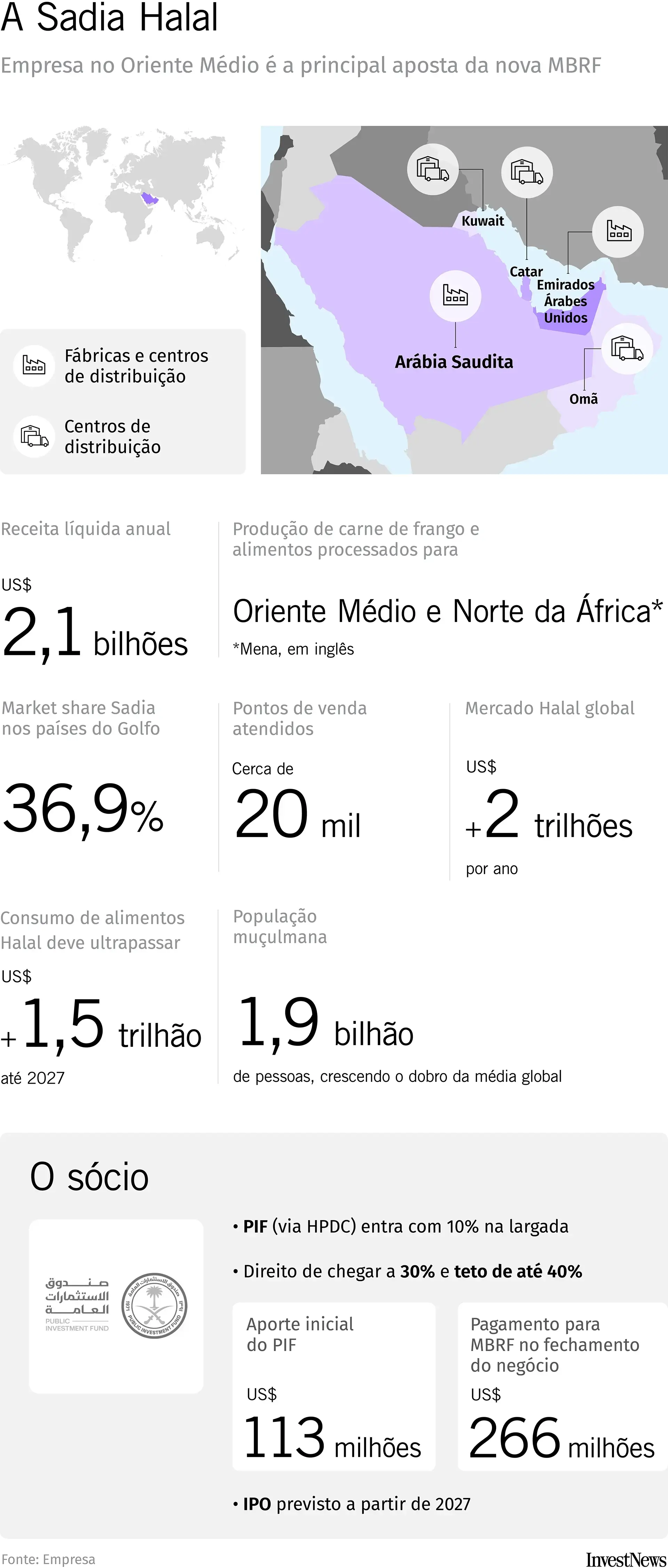 A Sadia Halal nasce com a ambição de realizar um IPO na Bolsa de Riade já em 2027. Com faturamento anual de US$ 2,1 bilhões (cerca de R$ 11,3 bilhões) e lucro operacional (Ebitda) de US$ 230 milhões, a companhia tem presença em toda a região MENA — sigla em inglês para Oriente Médio e Norte da África —, onde a marca desfruta de um prestígio raro para um produto brasileiro.