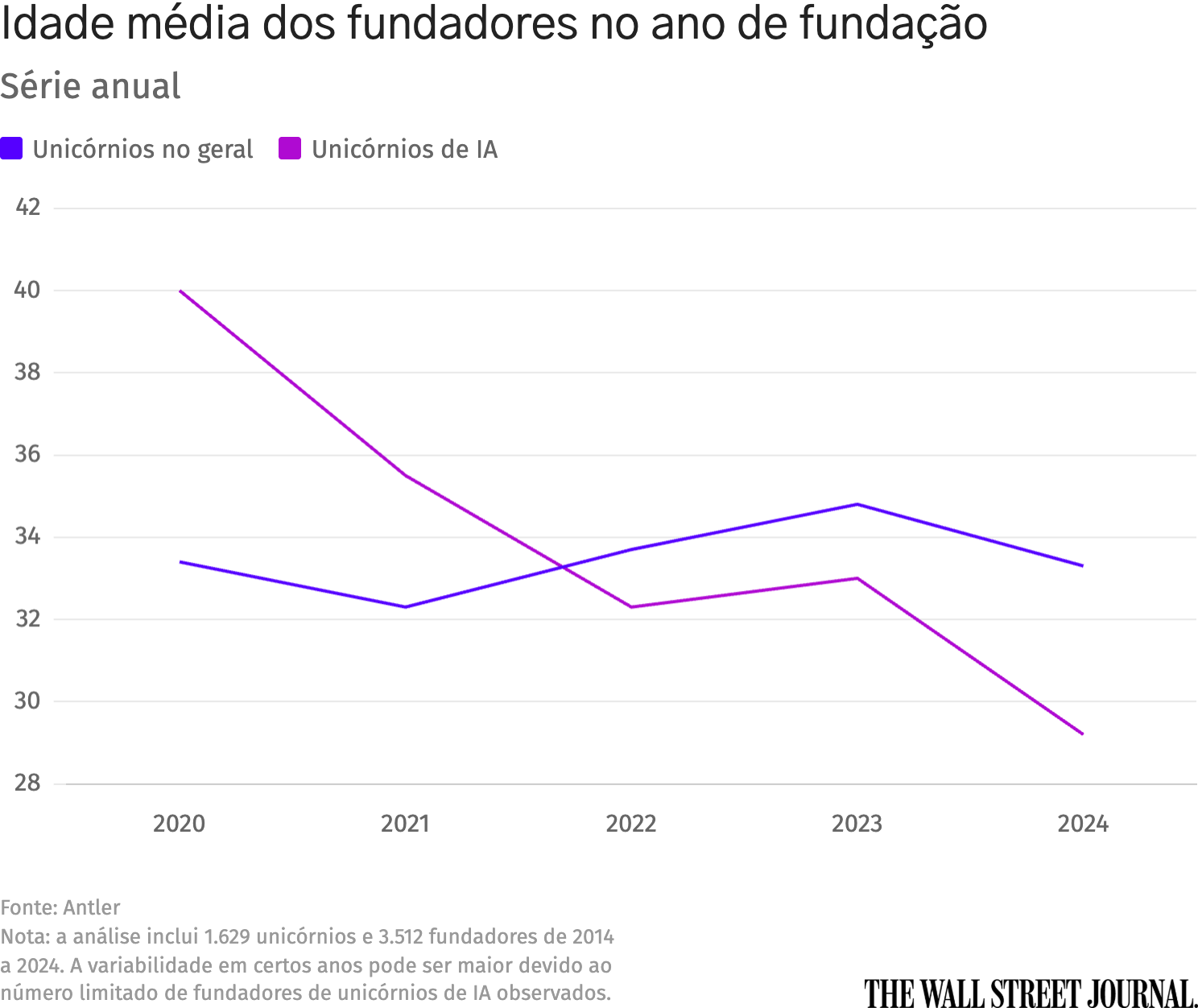 A competição para investir nos melhores talentos é intensa, e esses talentos estão cada vez mais jovens. A idade média dos fundadores dos chamados unicórnios de IA, empresas avaliadas em mais de US$ 1 bilhão,caiu de 40 anos em 2020 para 29 anos em 2024, segundo a empresa de investimentos Antler.